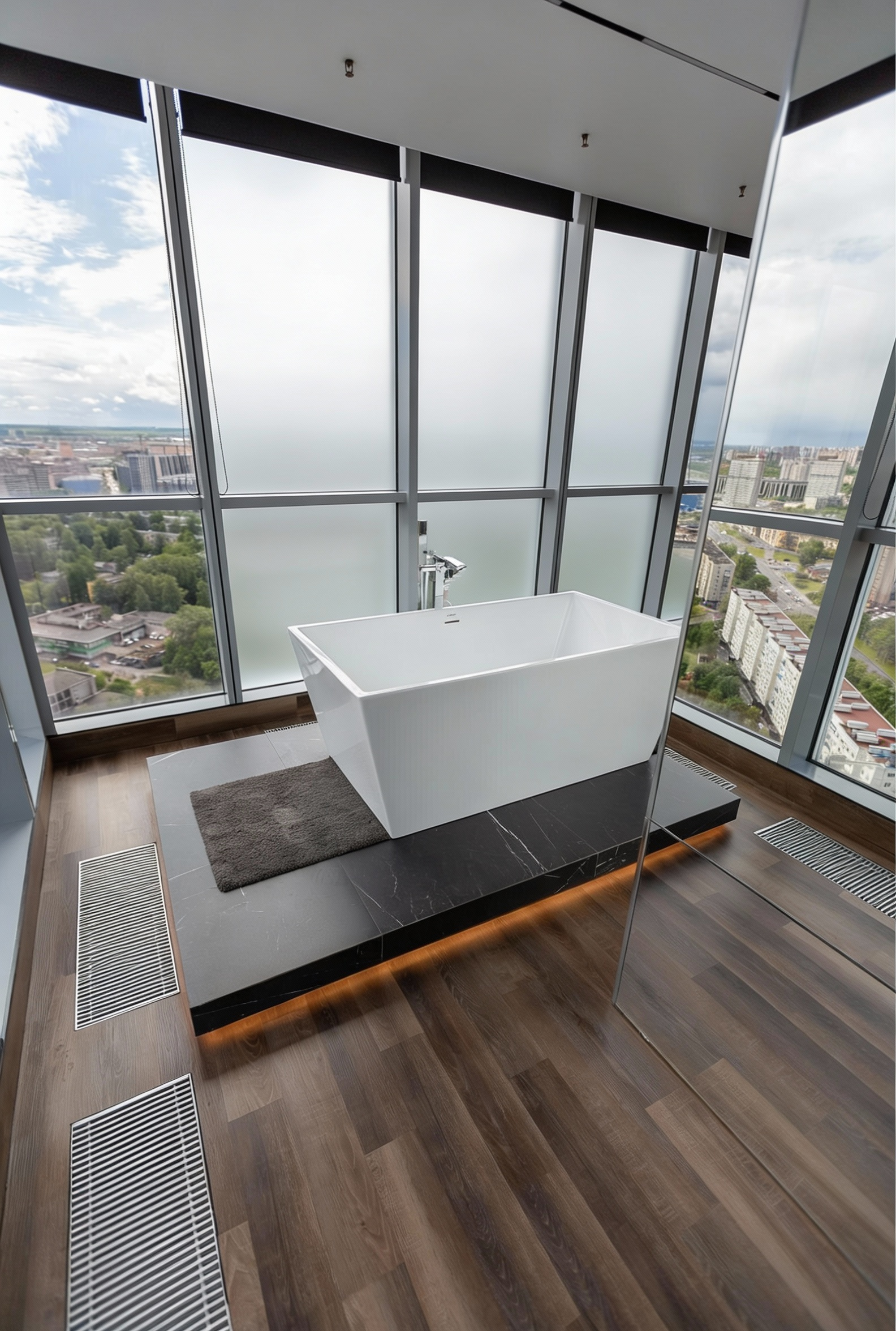 To rozwiązanie dobrze wygląda w nowoczesnych wnętrzach: płytki, szkło, minimalizm, proste linie. Zamiast kolejnego elementu dekoracyjnego lub praktycznego (który i tak trzeba czyścić), folia elektryczna na okno w łazience pozwala utrzymać wizualny porządek i „lekkość” aranżacji.